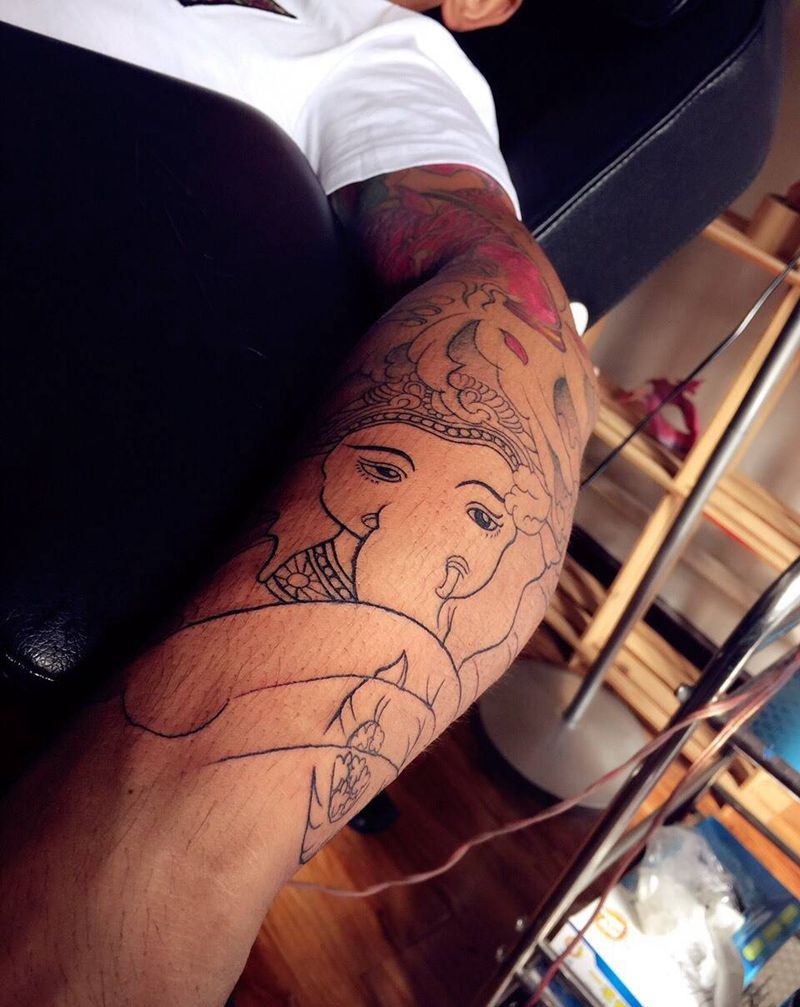 当前位置: 首页 >宁夏银川市纹身店-故幽刺青工作室(vian)纹身图案>象神线条完成纹身图片