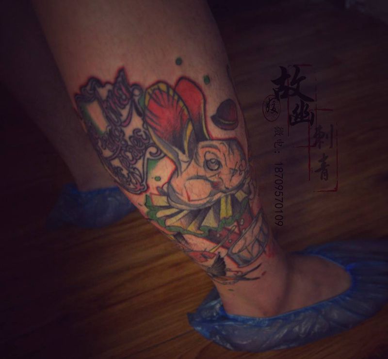 • T包小腿吹火男+阿多福纹身图片_腿部老传统新传统吹火男阿