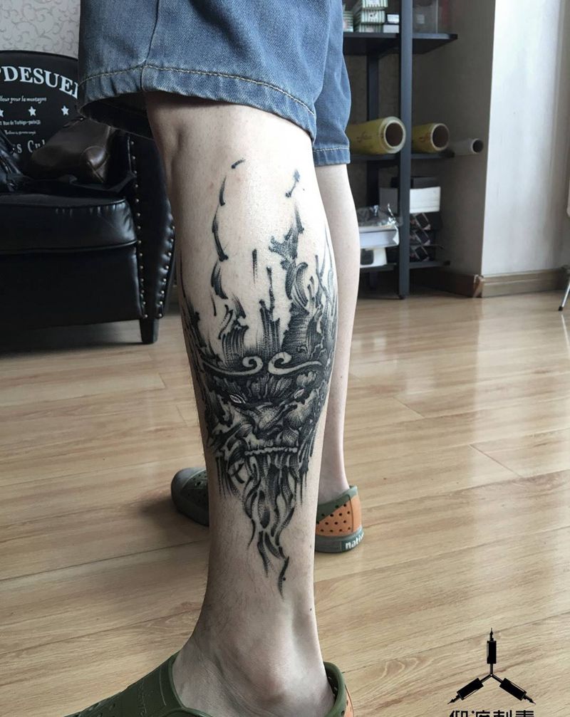 • T网红王老大花腿龙纹身图片_腿部新传统纹身图案