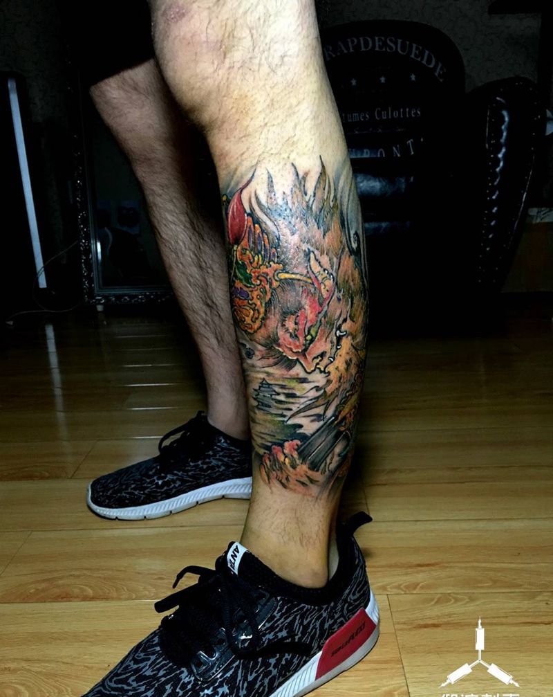 • T网红王老大花腿龙纹身图片_腿部新传统纹身图案