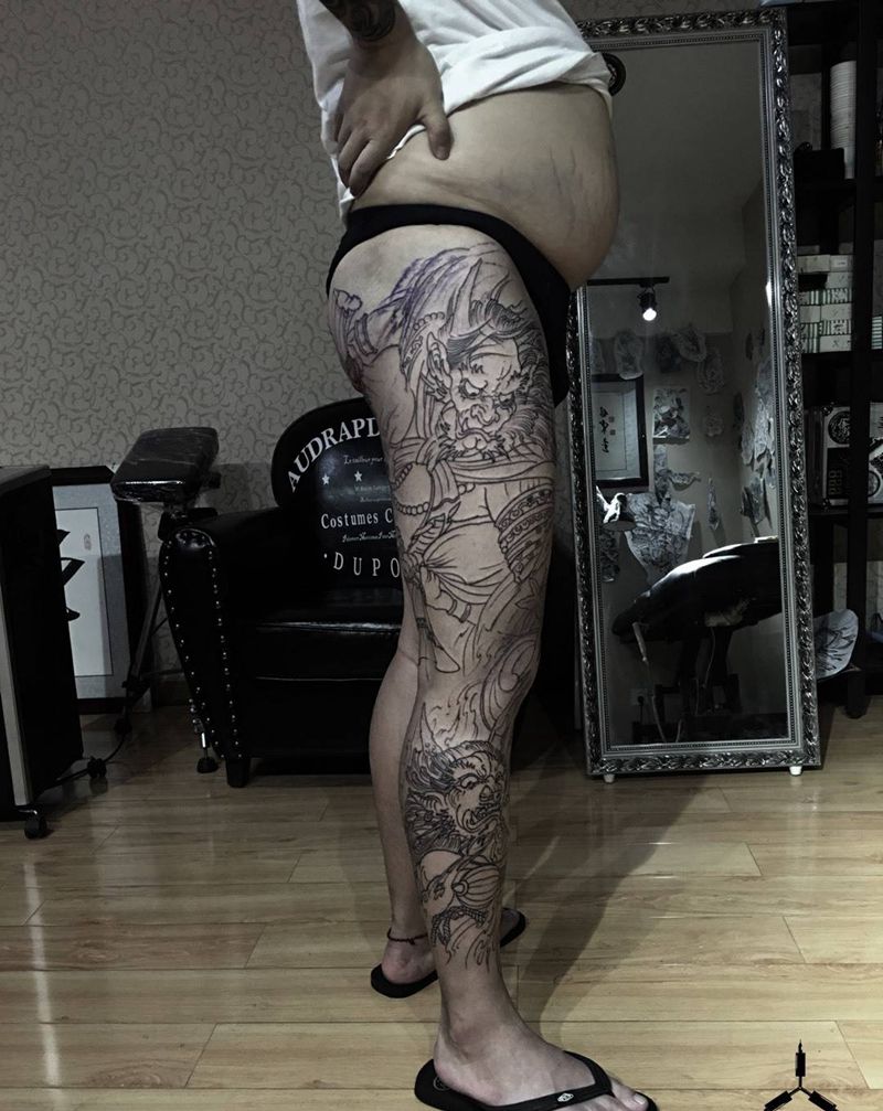 • T网红王老大花腿龙纹身图片_腿部新传统纹身图案