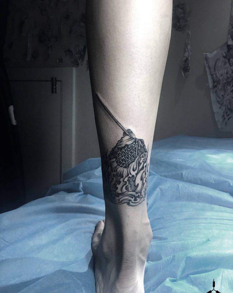 • T包小腿吹火男+阿多福纹身图片_腿部老传统新传统吹火男阿
