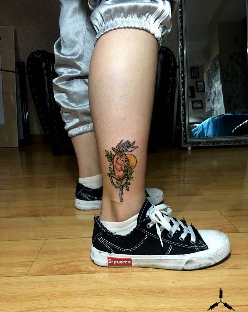 鹿/脚踝/仰渡纹身图片_腿部水彩纹身图案