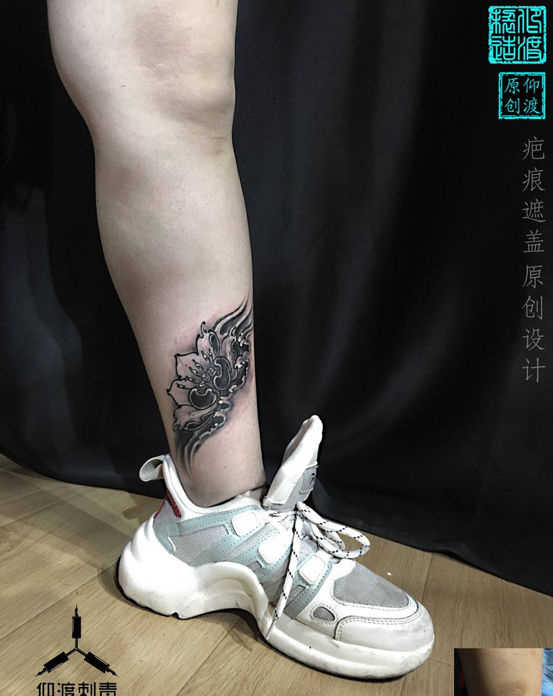 新传统/荷花/伤疤遮盖纹身图片_腿部新传统原创纹身图案