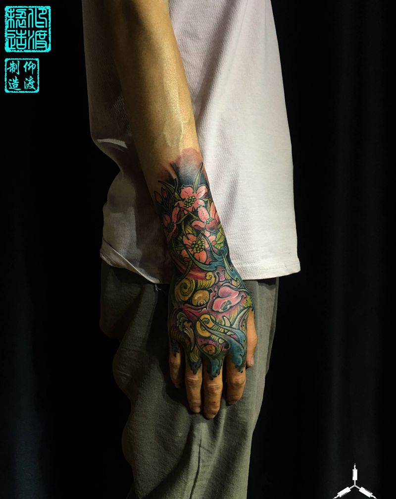 当前位置: 首页 >宁夏银川市纹身店-仰渡刺青纹身图案>新传统手背/富贵唐狮/彩色纹身图片_手部手臂新传统纹身图案