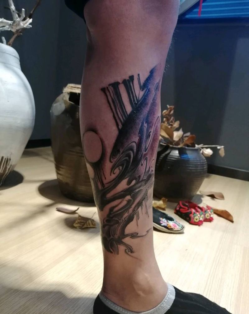 水墨纹身图片_腿部纹身图案