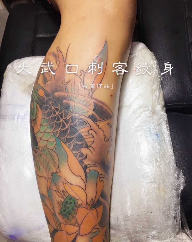 当前位置: 首页 >宁夏石嘴山市纹身店-大武口刺客纹身纹身图案>本店作品,小腿锦鲤纹身图片