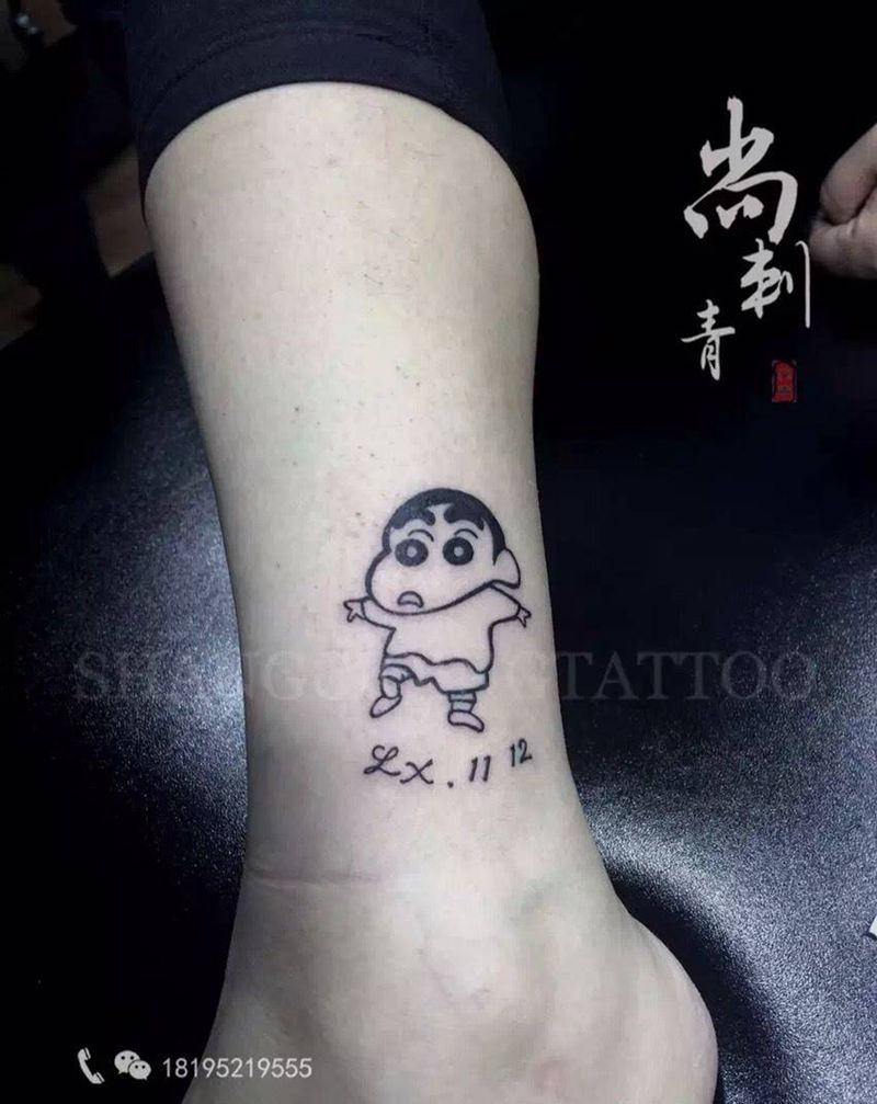 蜡笔小新纹身图片_成品腿部欧美清新人物卡通纹身图案