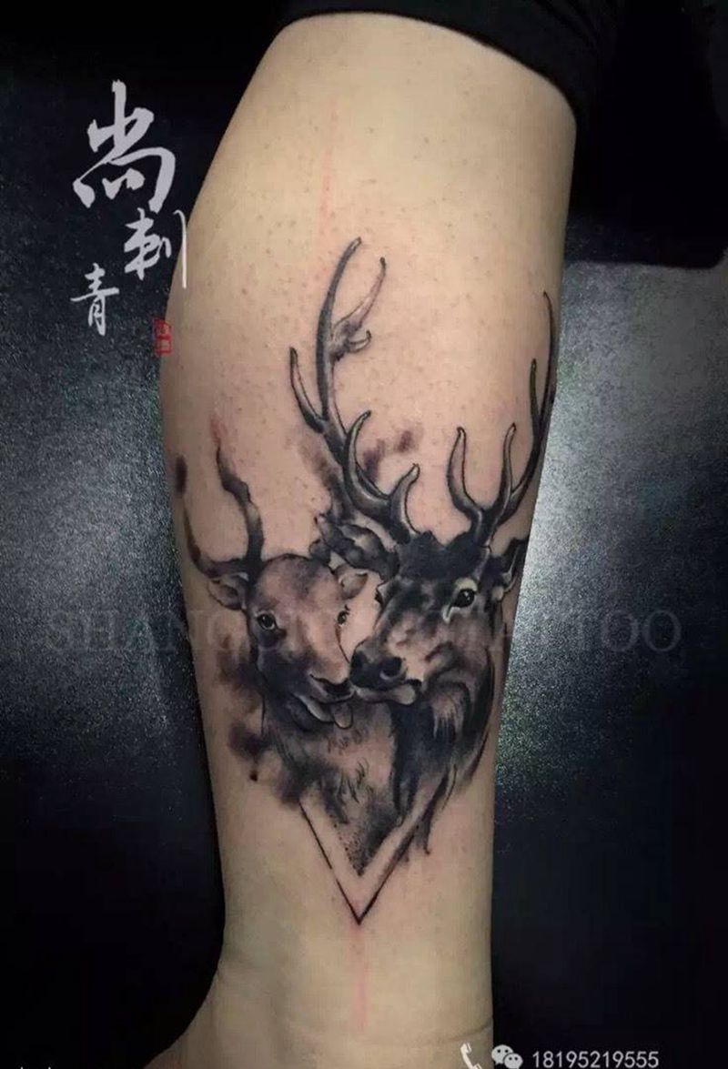 情侣小鹿纹身图片_成品腿部清新欧美动物原创纹身图案