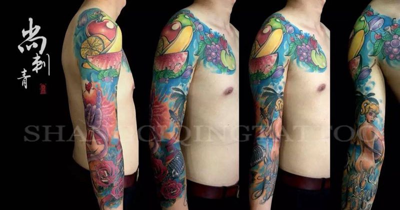 当前位置: 首页 >宁夏银川市纹身店-硬客(INK)tattoo studio纹身图案>欧美全彩花臂纹身图片_成品手臂胸部欧美植物人物原创纹身图案