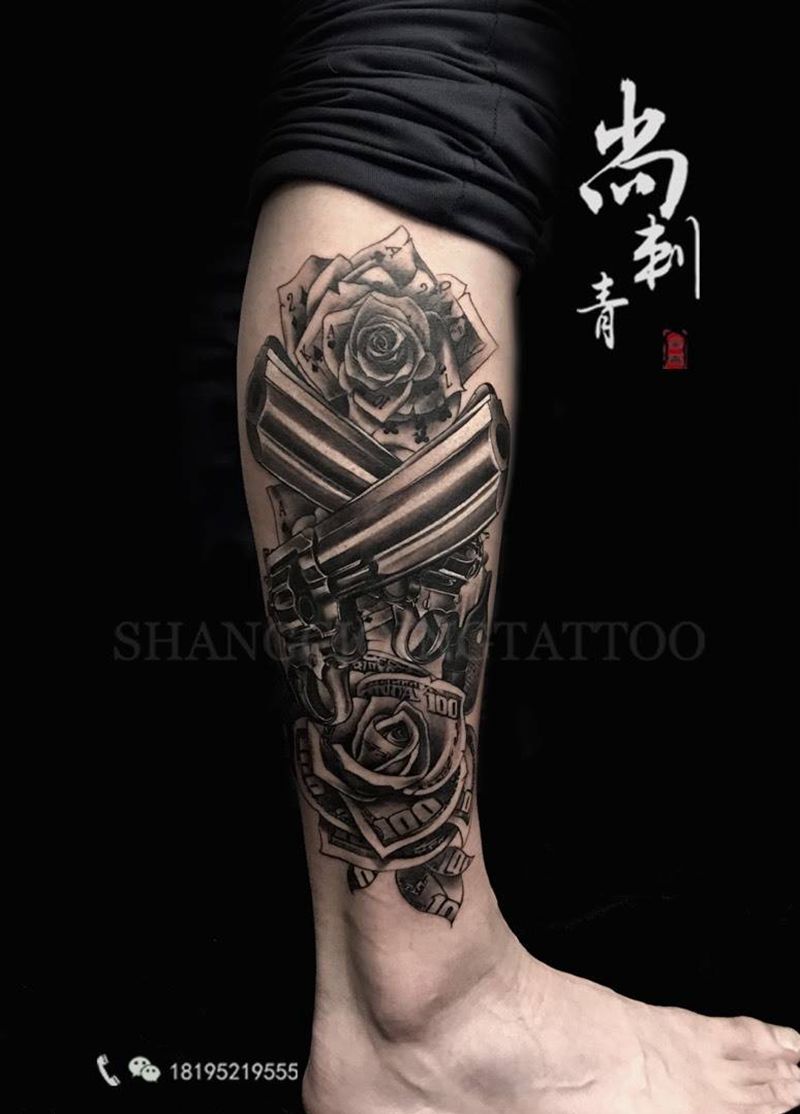 枪花纹身图片_成品腿部欧美静物纹身图案