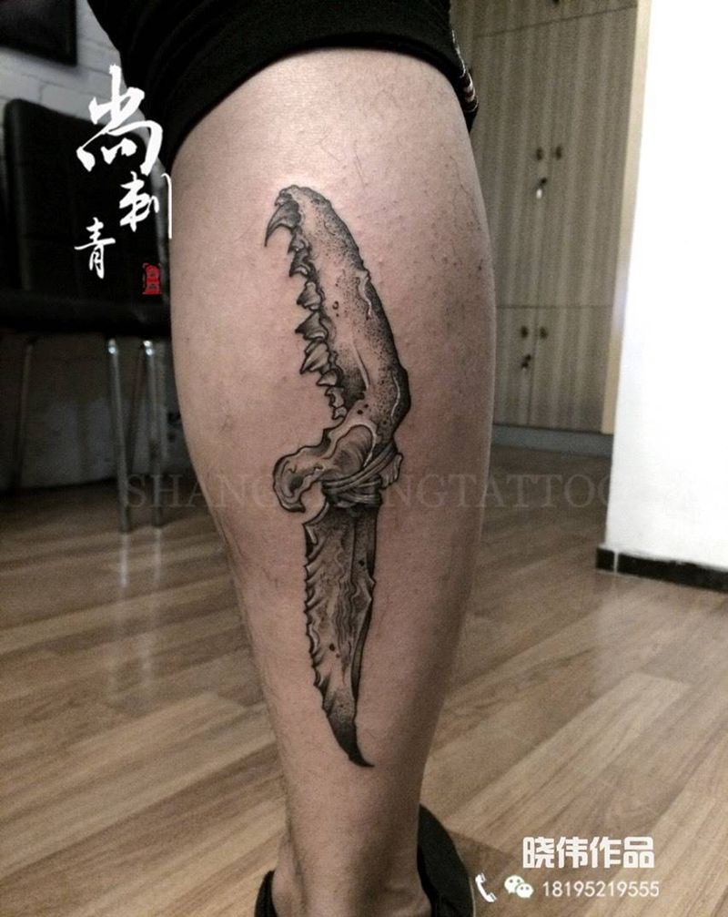 骨刀匕首纹身图片_成品腿部欧美清新静物纹身图案