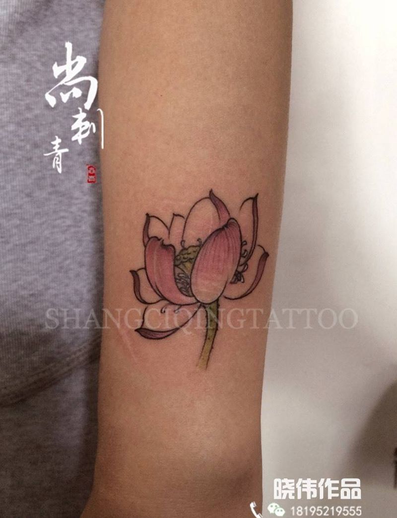 当前位置: 首页 >宁夏银川市纹身店-硬客(INK)tattoo studio纹身图案>荷花纹身图片_成品手臂清新传统植物纹身图案