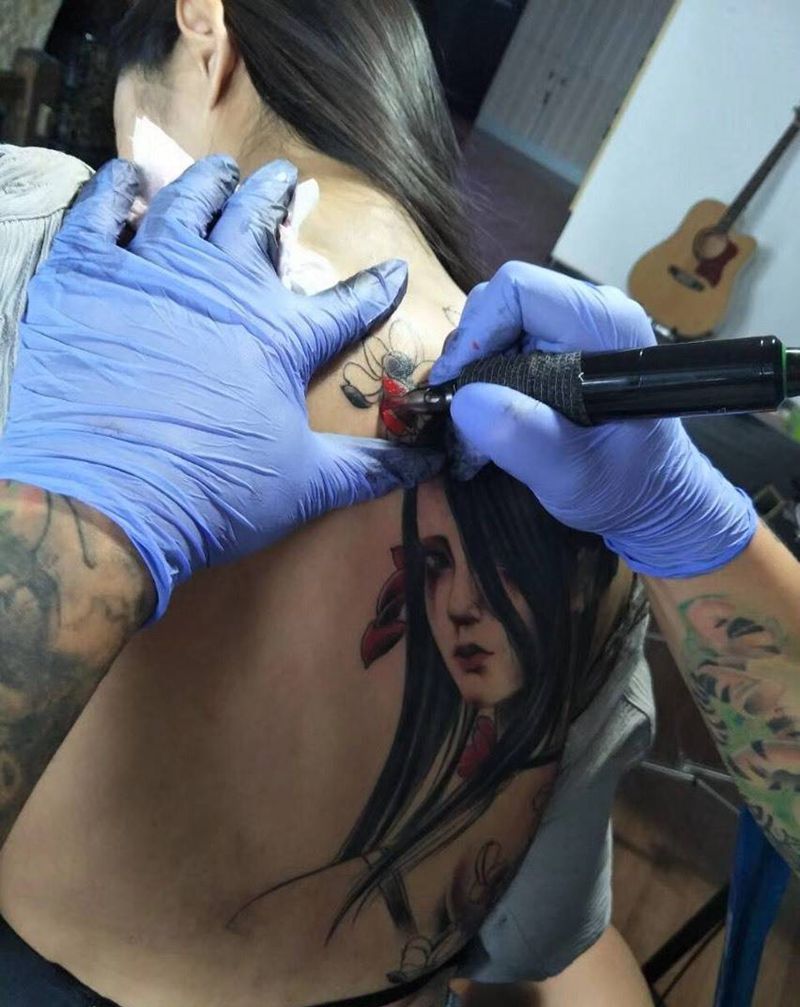 当前位置: 首页 >宁夏银川市纹身店-硬客(INK)tattoo studio纹身图案>遮盖纹身图片_成品背部清新人物遮盖传统纹身图案