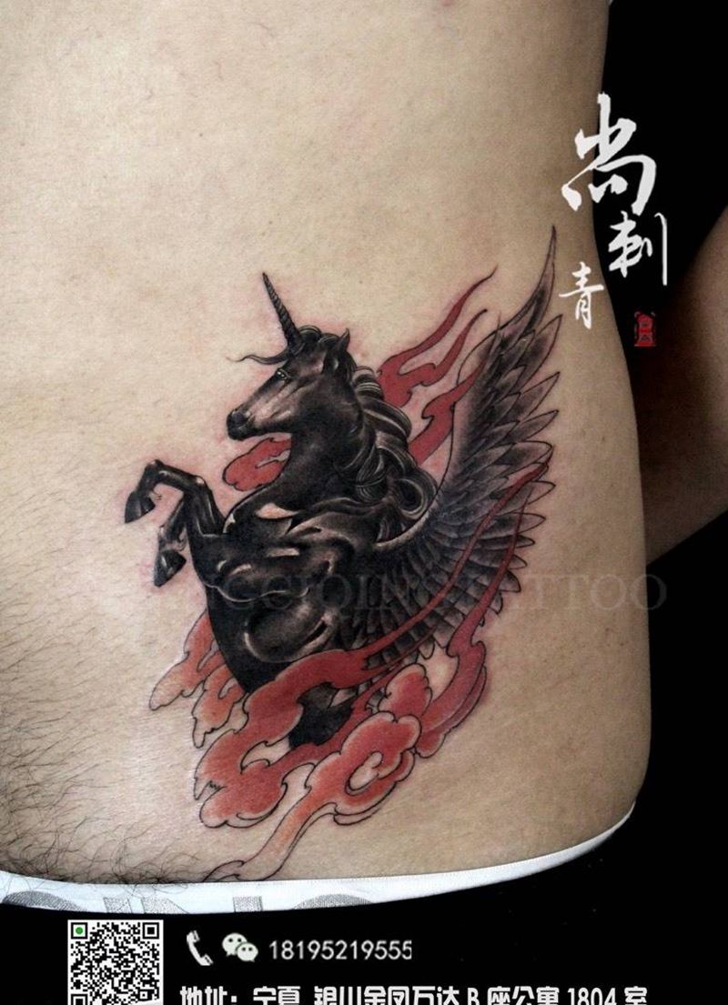 当前位置: 首页 >宁夏银川市纹身店-硬客(INK)tattoo studio纹身图案>独角兽纹身图片_成品腰部欧美传统动物纹身图案