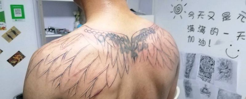 翅膀遮盖老图未完成纹身图片_背部纹身图案