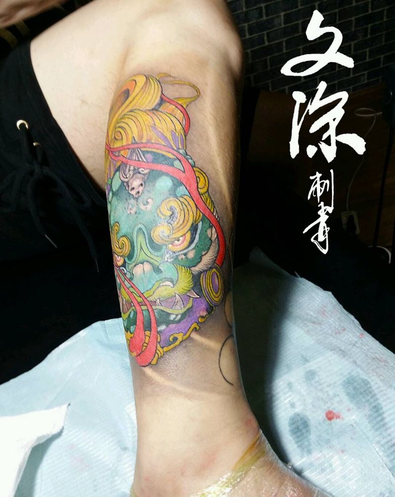 当前位置: 首页 >宁夏银川市纹身店-文涂刺青纹身图案>唐狮包小腿纹身图片_腿部传统动物纹身图案