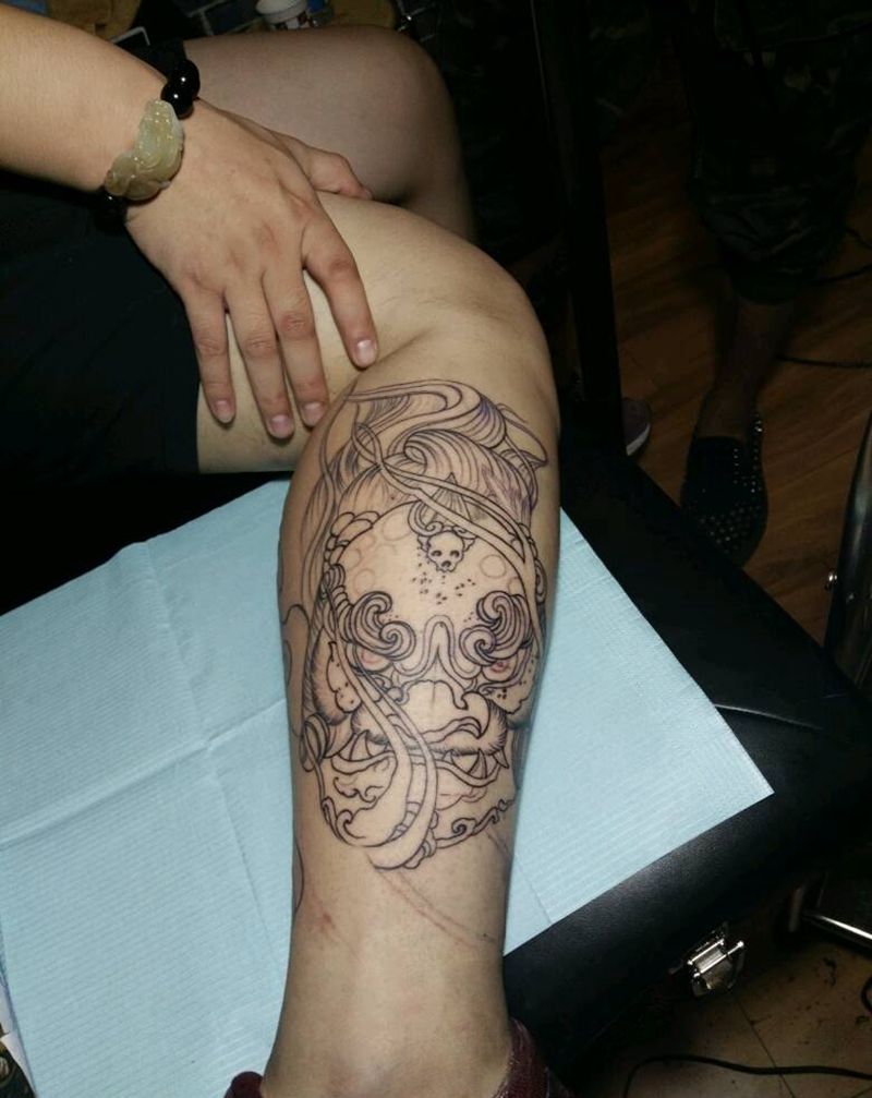 • T网红王老大花腿龙纹身图片_腿部新传统纹身图案