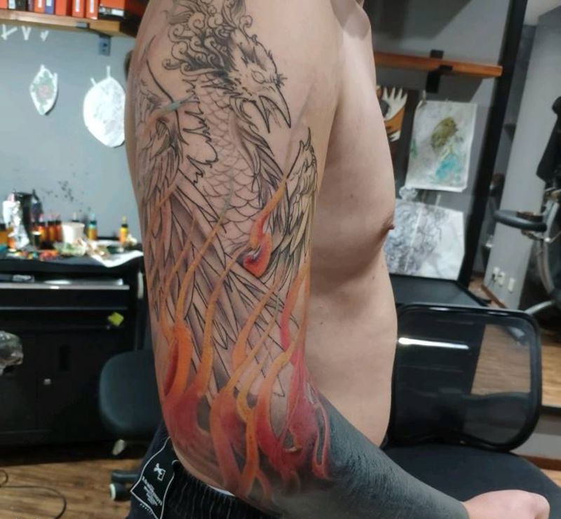 当前位置: 首页 >宁夏银川市纹身店-九隐刺青纹身图案>黑臂浴火重生凤凰纹身图片_手臂新传统黑臂纹身图案