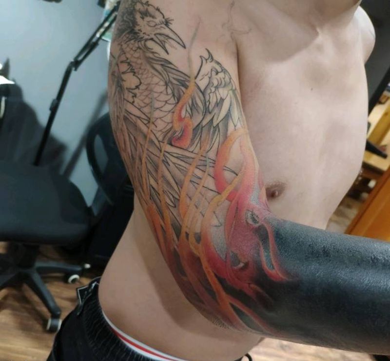 当前位置: 首页 >宁夏银川市纹身店-九隐刺青纹身图案>黑臂浴火重生凤凰纹身图片_手臂新传统黑臂纹身图案