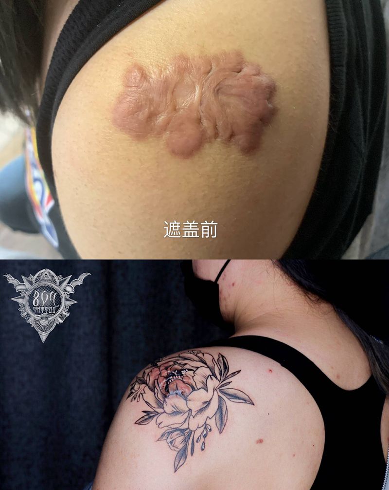 素花遮盖疤痕纹身图片_肩部点刺纹身图案