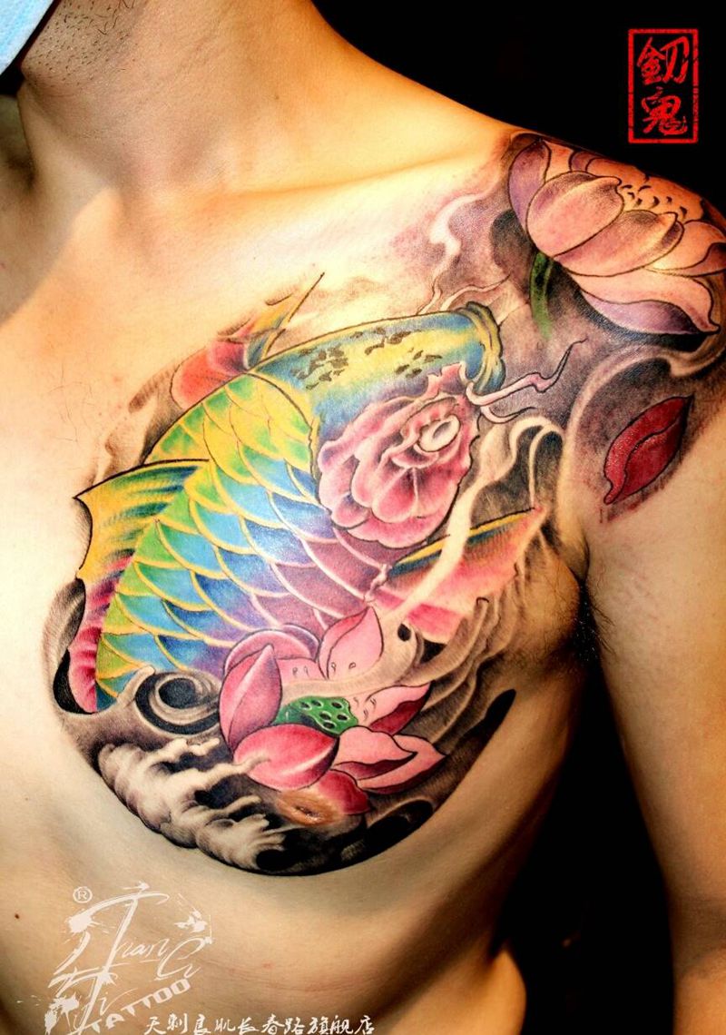 彩色鱼纹身图片_肩部胸部传统动物成品纹身图案