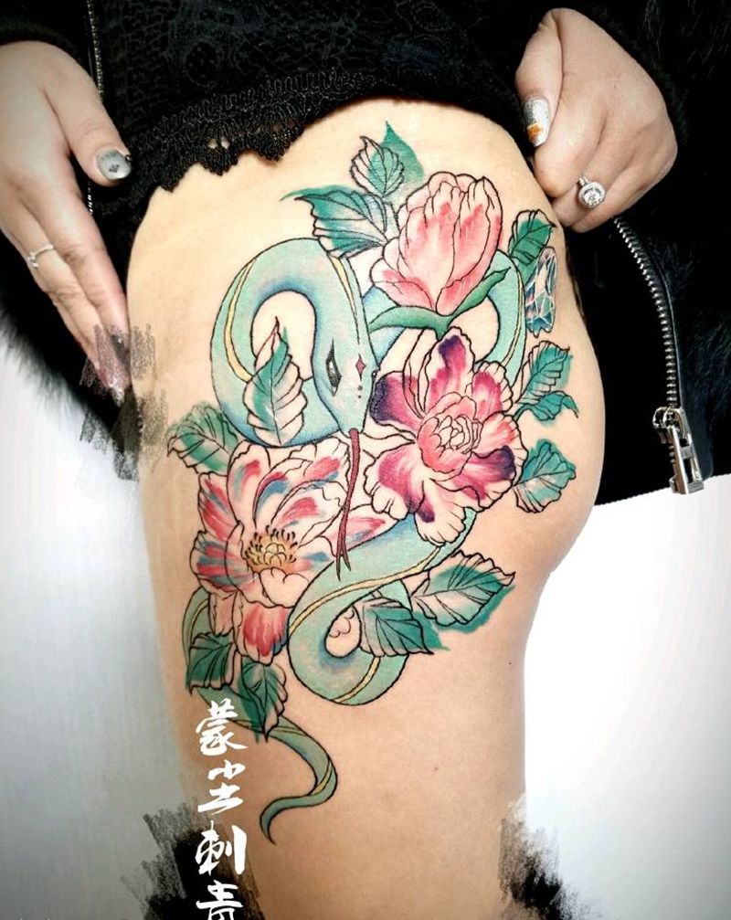 蛇纹身,大腿纹身图片_腿部欧美国画动物植物成品纹身图案
