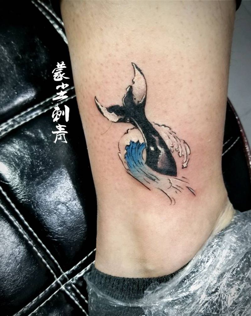 小清新,鲸尾加浪纹身纹身图片_腿部脚部清新动物成品纹身图案