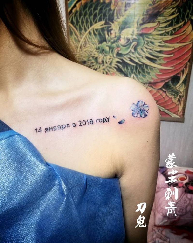 当前位置: 首页 >新疆乌鲁木齐市纹身店-魔彫刺青纹身图案>锁骨俄语字母彩色小花纹身图片