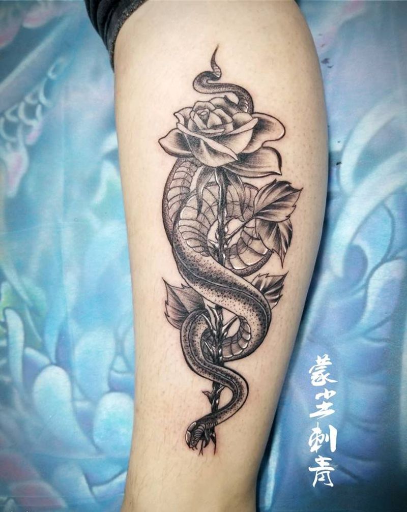 小腿蛇加玫瑰纹身图片_腿部欧美动物植物成品纹身图案