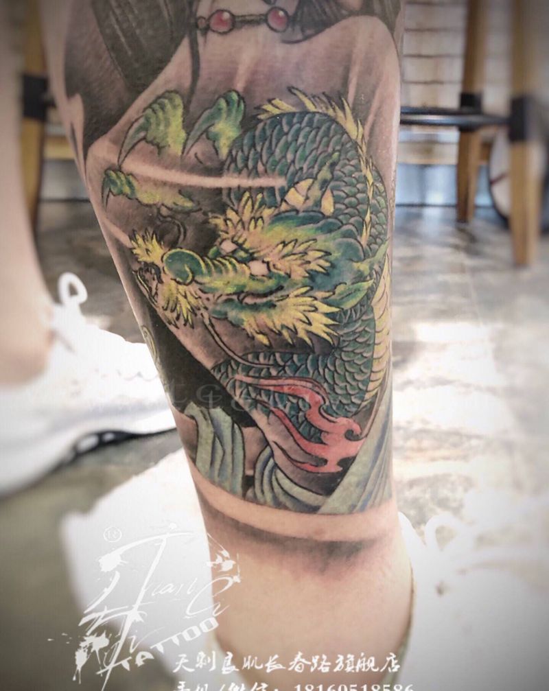 • T网红王老大花腿龙纹身图片_腿部新传统纹身图案