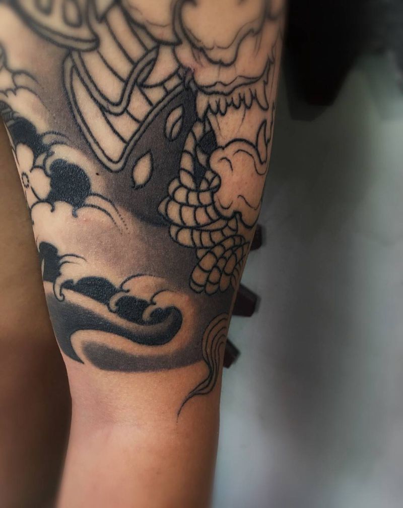 • T网红王老大花腿龙纹身图片_腿部新传统纹身图案
