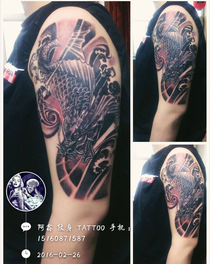 大臂#鳌鱼#纹身图片_成品手臂传统动物纹身图案