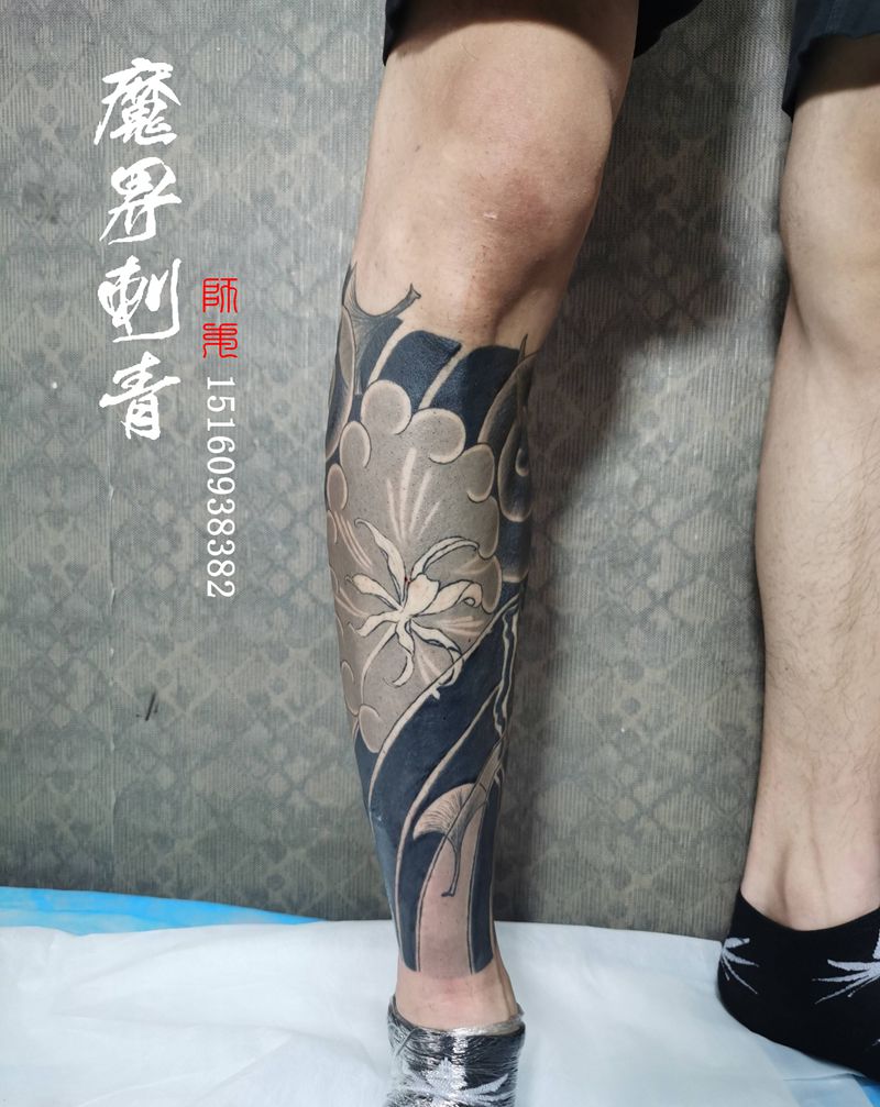 当前位置: 首页 >新疆乌鲁木齐市纹身店-魔界纹身纹身图案>老传统包小腿纹身图片_腿部老传统彼岸花日式风格包小腿纹身图案