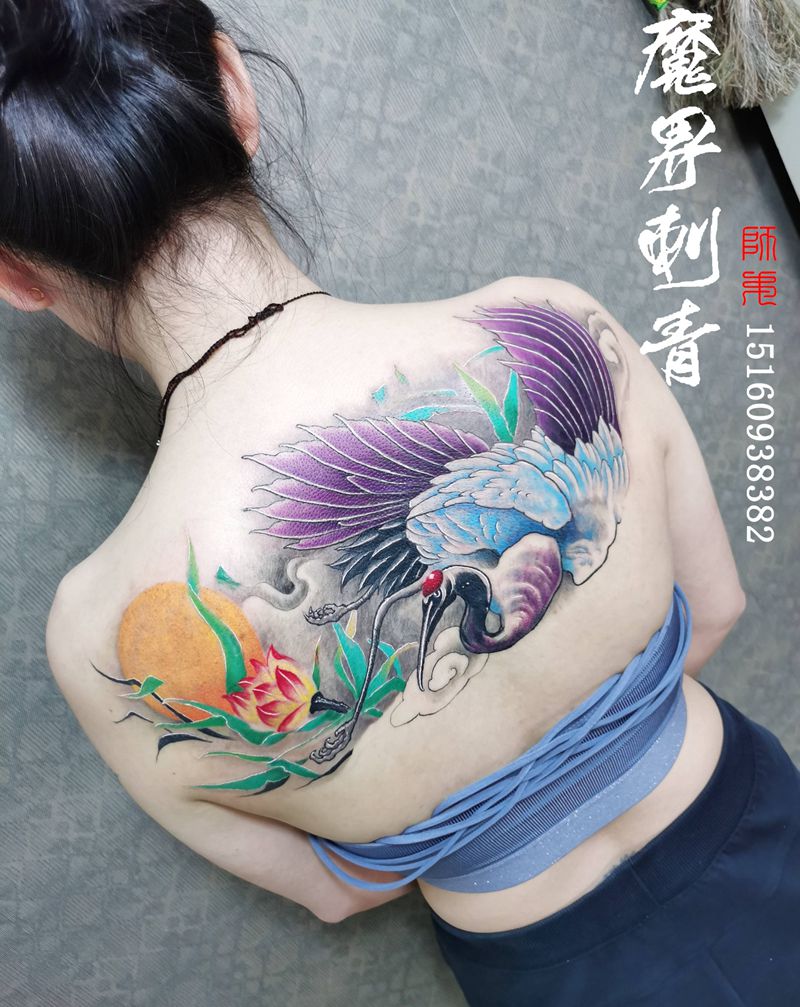 当前位置: 首页 >新疆乌鲁木齐市纹身店-魔界纹身纹身图案>仙鹤纹身图片_背部新传统彩色仙鹤后背半背女生后背纹身图案