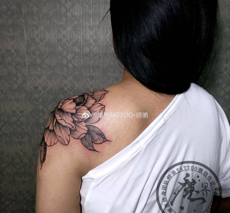 肩膀素花牡丹纹身图片_肩部新传统几何素花纹身图案