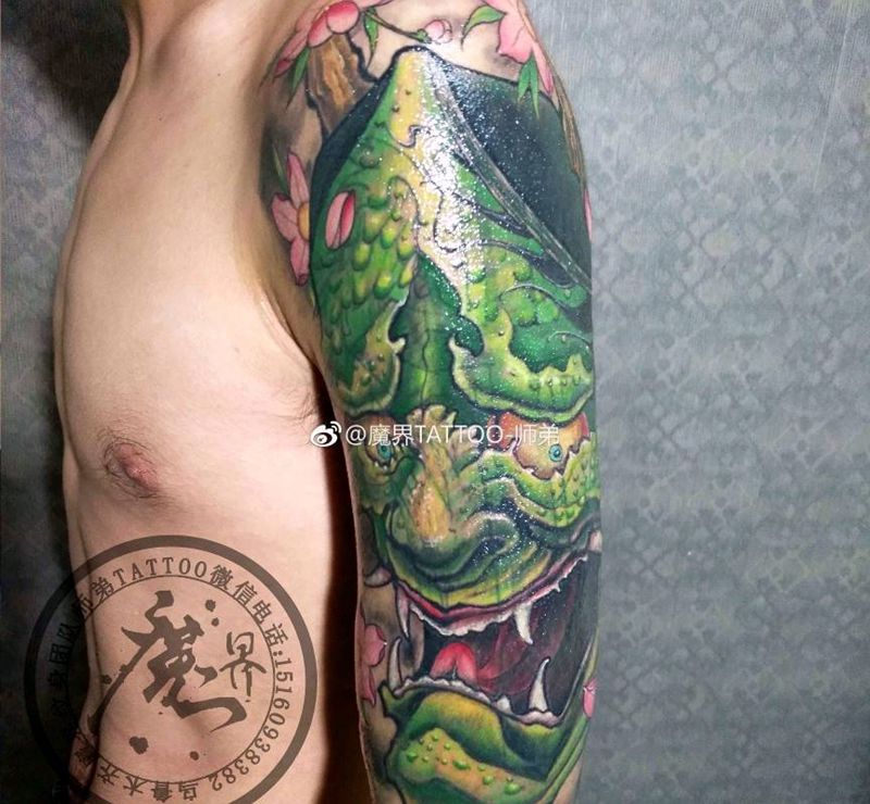 花臂(遮盖)纹身图片_手臂传统植物鬼神图腾原创成品纹身图案
