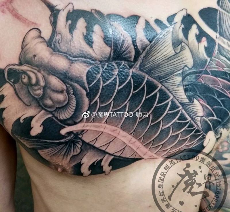 花胸鲤鱼遮盖(原创)纹身图片_胸部新传统纹身图案
