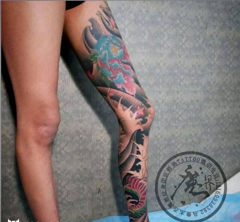 原创花腿纹身图片_腿部老传统新传统版雾彩色花腿般若 蛇纹身图案