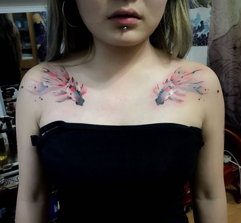 当前位置: 首页 >新疆乌鲁木齐市纹身店-峙刺青·TATTOO纹身图案>肩花·泼墨鱼纹身图片_肩部清新动物彩色水墨纹身图案