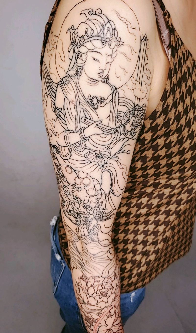 花臂文殊菩萨纹身图片_手臂新传统纹身图案