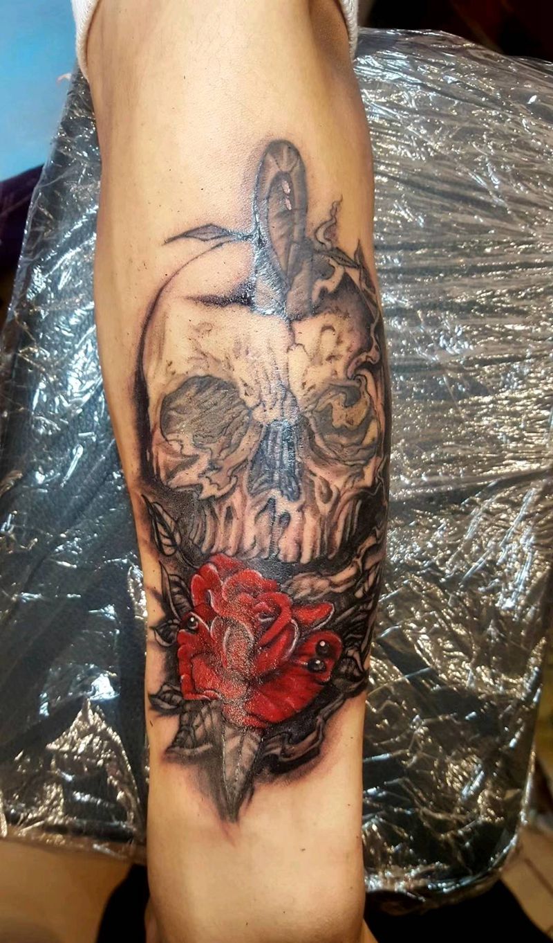当前位置: 首页 >新疆乌鲁木齐市纹身店-天山刺客纹身图案>骷髅玫瑰纹身图片_手臂纹身图案