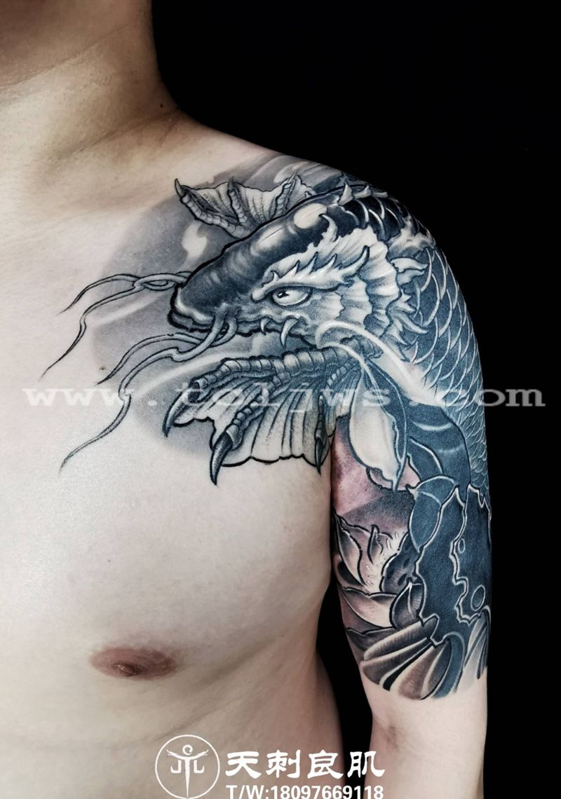 鳌鱼纹身 鱼纹身遮盖纹身图片_手臂胸部新传统鳌鱼鱼遮盖纹身图案