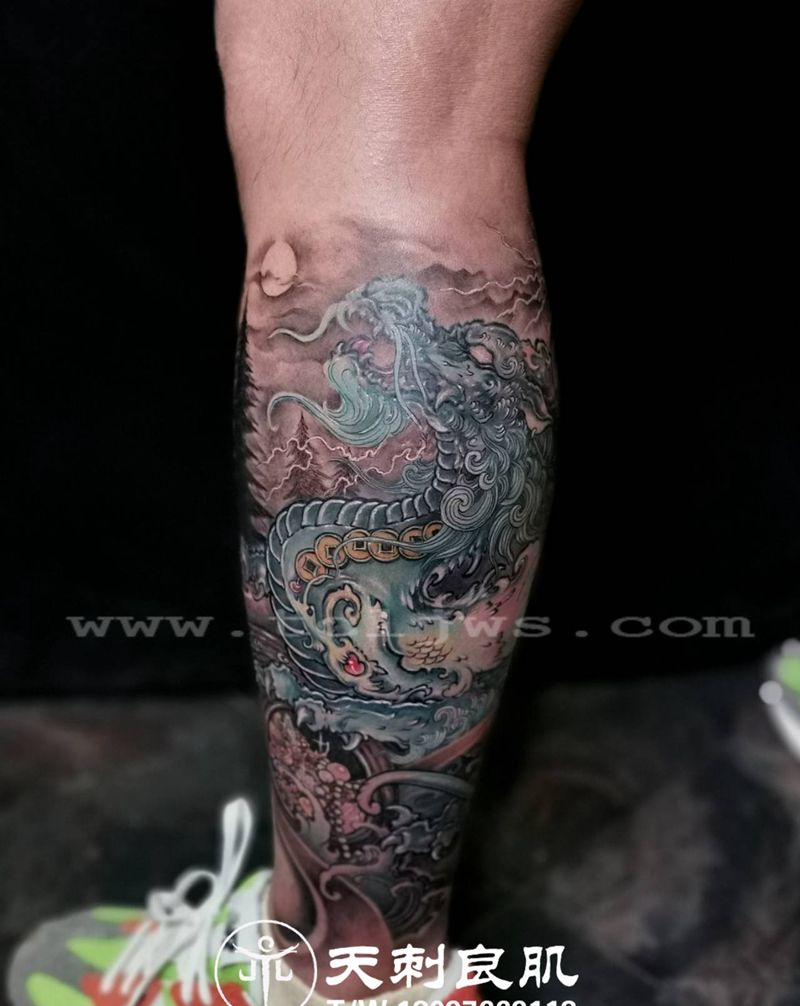 • T网红王老大花腿龙纹身图片_腿部新传统纹身图案