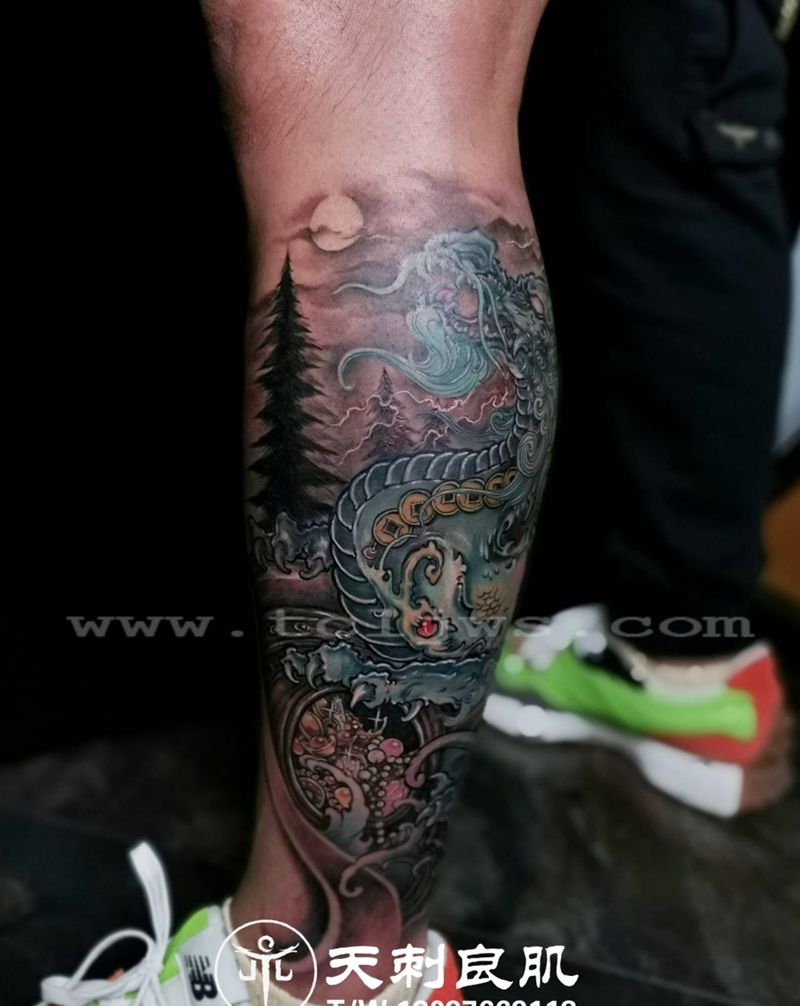 • T网红王老大花腿龙纹身图片_腿部新传统纹身图案