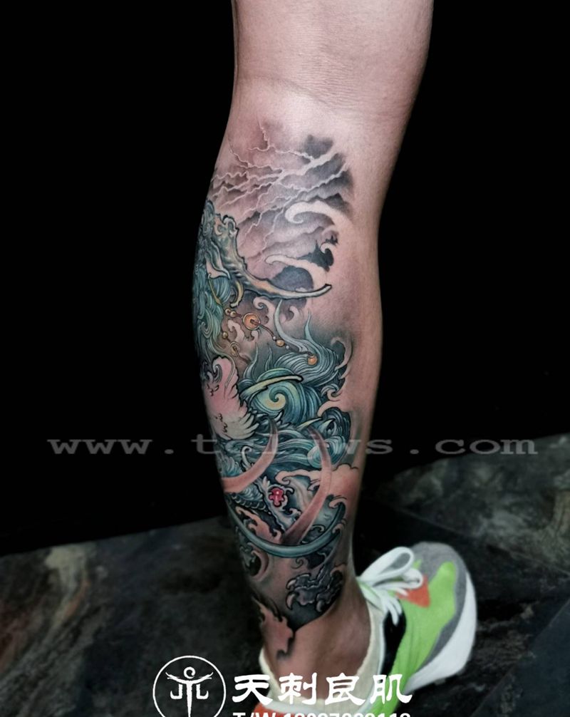 • T网红王老大花腿龙纹身图片_腿部新传统纹身图案