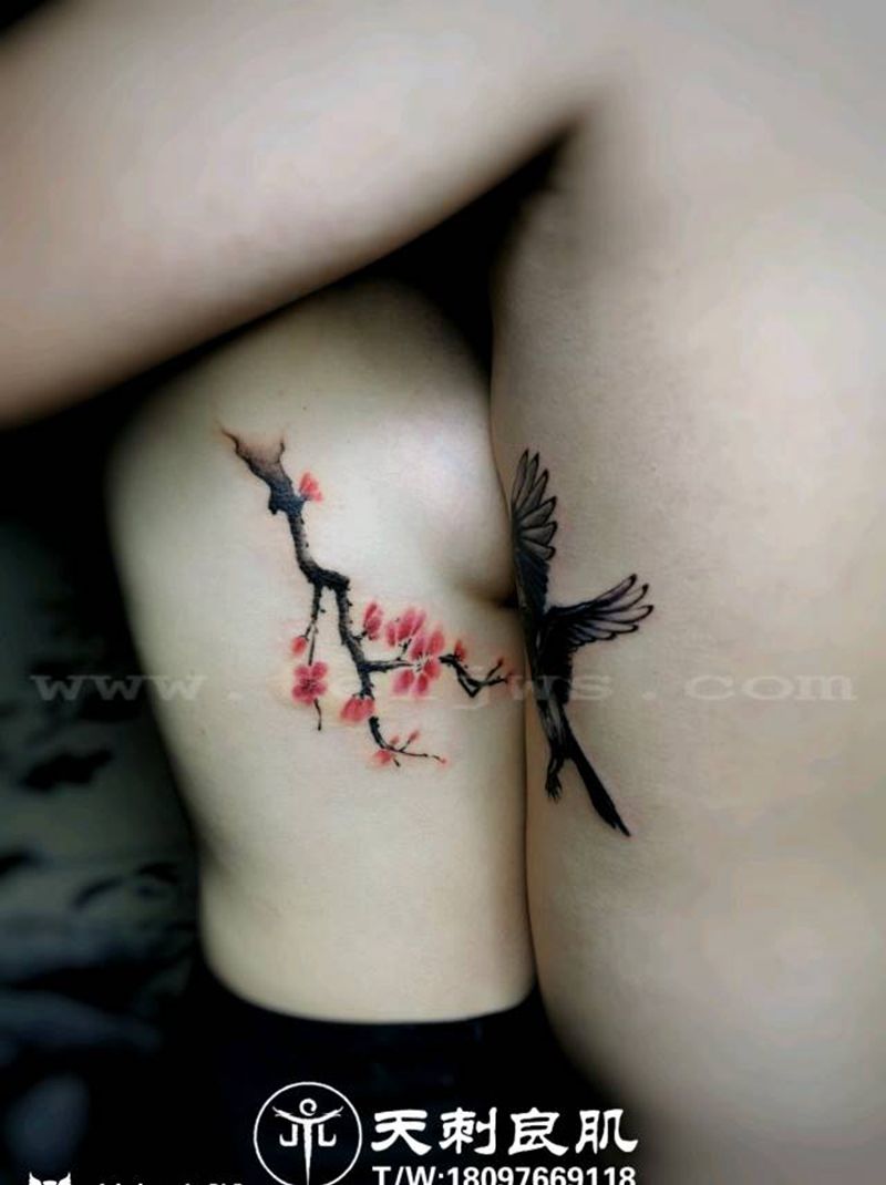 情侣纹身—喜上眉梢纹身图片_胸部腹部欧美写实新传统喜鹊梅花纹身图案