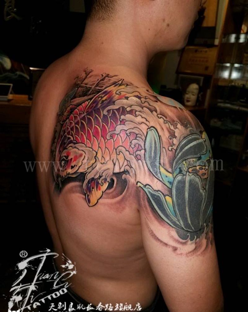 鲤鱼跃龙门纹身纹身图片_肩部胸部传统动物培训新疆成品纹身图案