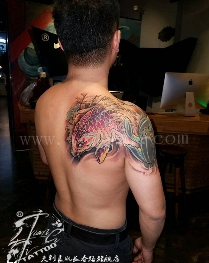 鲤鱼跃龙门纹身纹身图片_肩部胸部传统动物培训新疆成品纹身图案