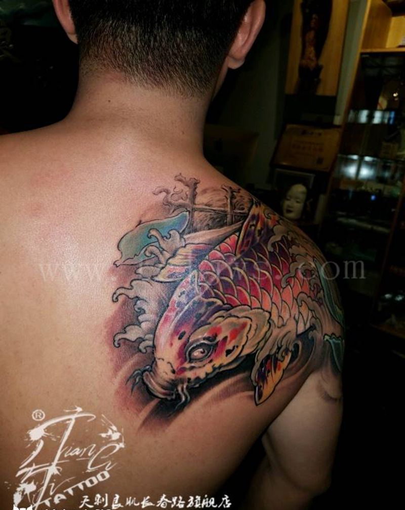鲤鱼跃龙门纹身纹身图片_肩部胸部传统动物培训新疆成品纹身图案